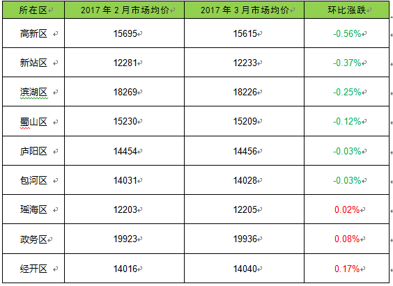 包河區共有八個板塊,其中五個板塊下跌,跌幅最高的為南園板塊-0.45%,與蜀山區相同也有三個板塊微漲,漲幅最高的為南站板塊0.71%。