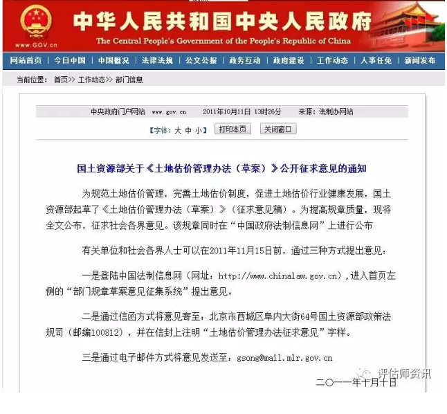 2011年10月,國土資源部辦公廳就《土地估價管理辦法(草案)》在法制信息網、國土資源部網站等向社會公開征求意見。征求意見稿主要對土地估價師執業登記與注銷,土地估價師的權利與義務,土地估價機構的設立與執業注冊,土地估價報告的備案與抽查,土地估價活動規范管理,土地估價師協會法律地位和法律責任等內容做了規定。明確了土地估價師資格與執業資格的取得方式、落實對土地估價機構的監督管理、規范土地估價活動和強化土地估價報告質量監督等內容。但在該辦法出臺前夕,由于各種原因而擱置。