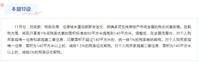 政策導向 | 2024年11月,房地產稅收優惠政策:購買面積不超過140㎡的,統一執行1%契稅