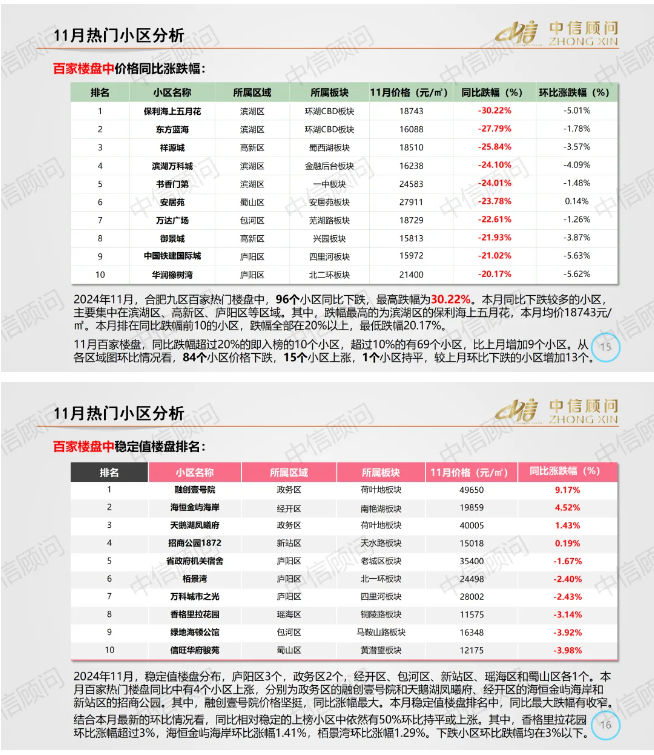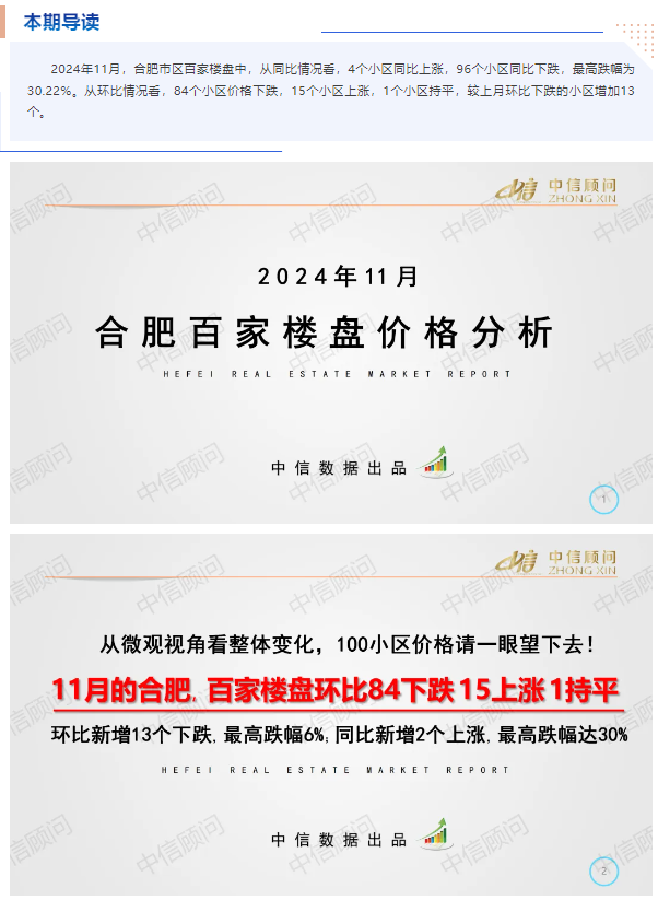 二手房市場 | 2024年11月,合肥百家樓盤環比84下跌15上漲1持平,較上月環比下跌增加13個